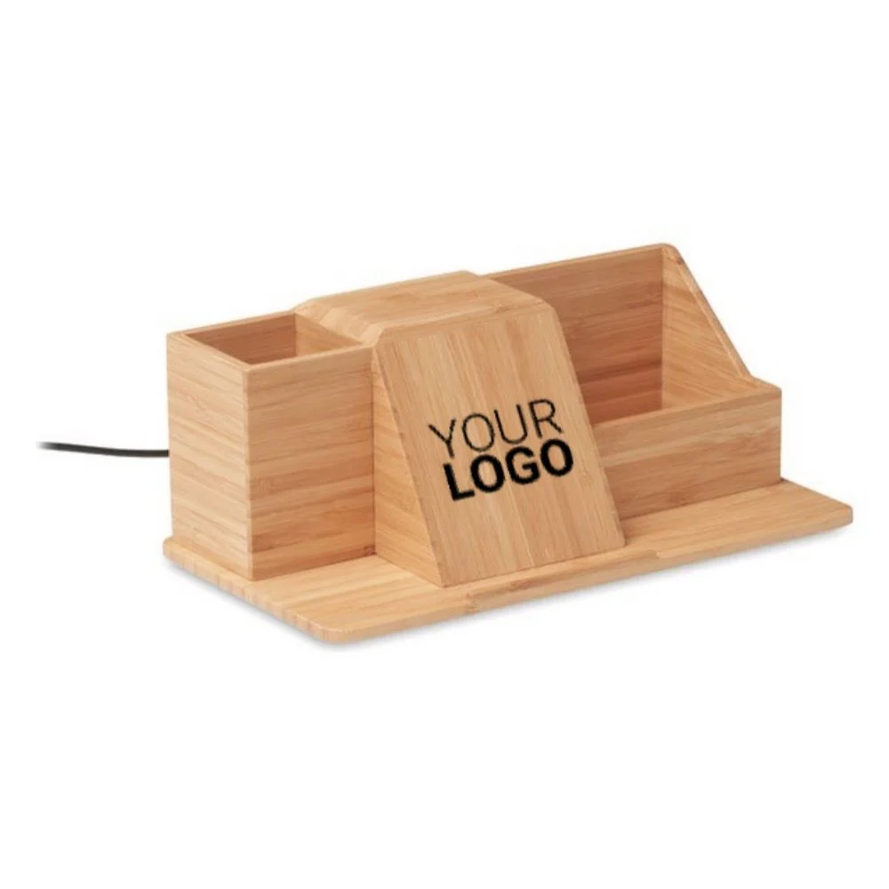 Schreibtisch-Organizer und Stiftehalter aus Bambus mit kabelloser 10 W-Ladestation für Smartphones. Bambus ist ein natürliches Produkt, es kann daher zu leichten Abweichungen in Farbe, Dekor und Maßen kommen.