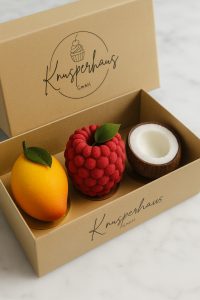 Handgemachte Patisserien in Frucht-Optik mit Mousse, Fruchtkern und Biskuit