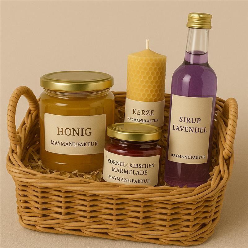 Ein regionaler Genusskorb mit Honig, Kornelkirschen-Marmelade, mittlerer Kerze, Weidenkorb und Lavendelsirup.