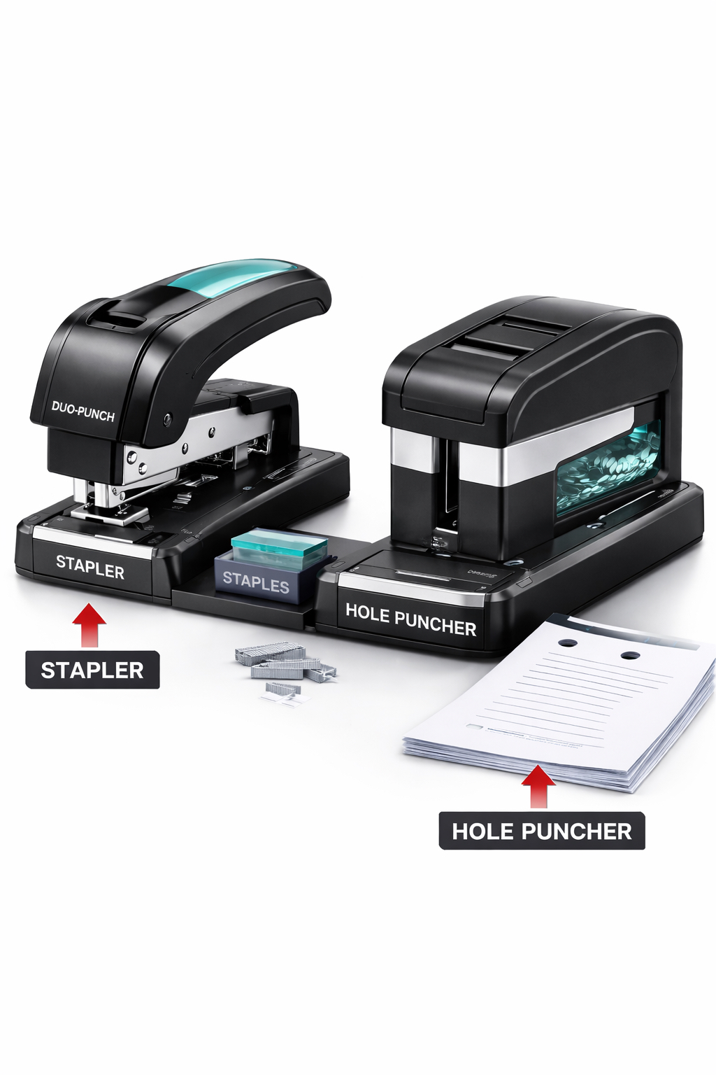 Lochstanzer und Tacker kombiniert zu einem Produkt. Ideal für Büro und Homeoffice. Robuste Konstruktion und ergonomisches Design. Effektiv und Präzise.
